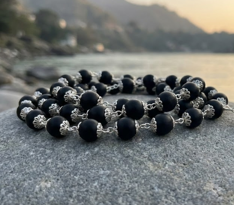 Unlock the ancient power of Karungali (Black Ebony Wood) in its most elegant form. This mala is not just strung; it is meticulously handcrafted where every single bead is capped with ornate silver accents and connected via durable silver wire links.