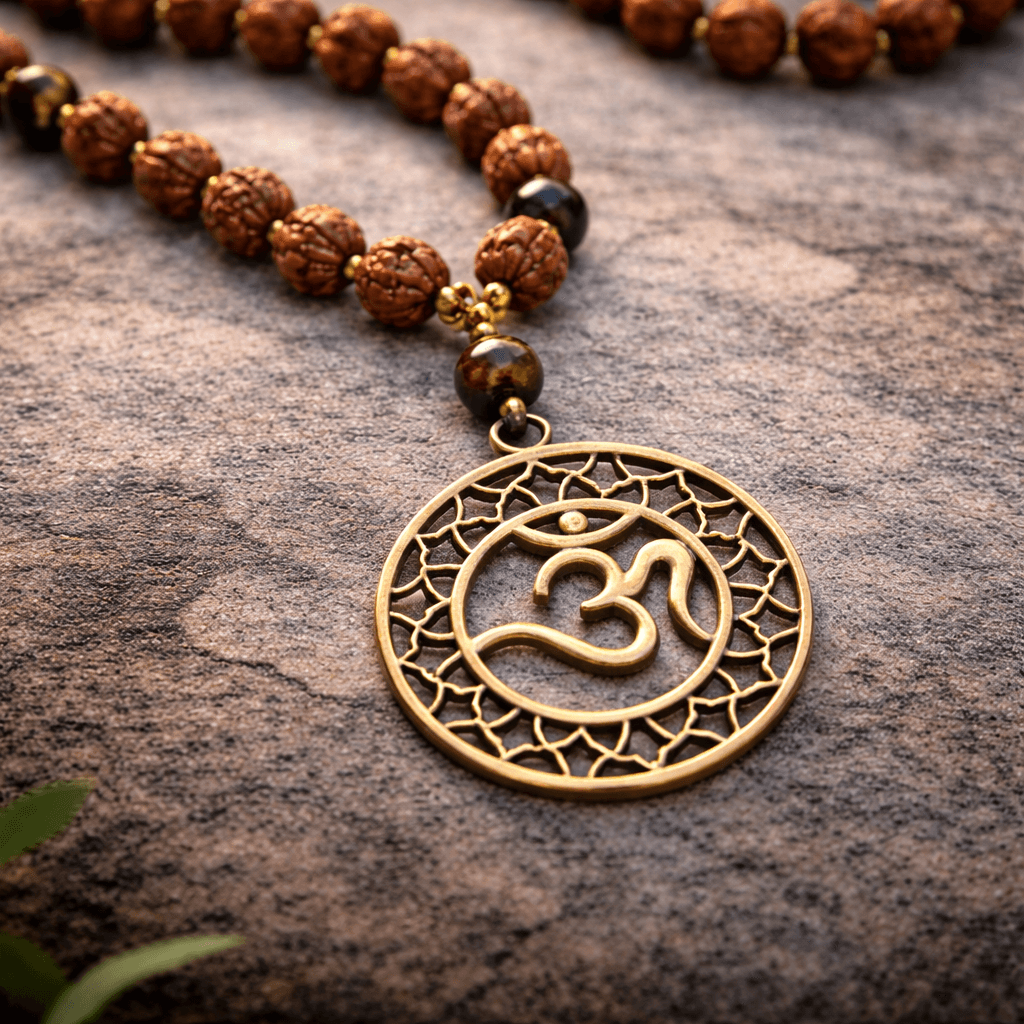 The Om pendant symbolises universal consciousness, peace, and spiritual awareness, adding deeper meaning to the mala. The natural brown tones of Rudraksha and the golden sheen of Tiger Eye give this mala a simple yet powerful appearance.